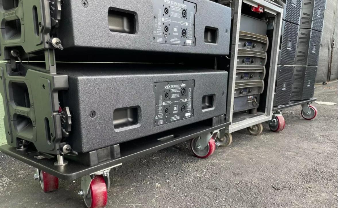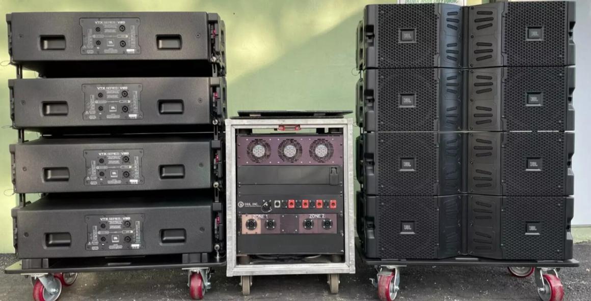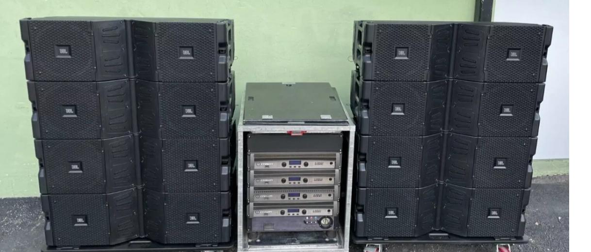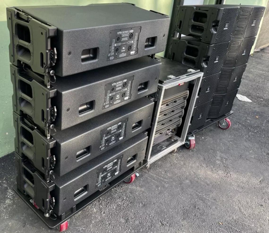 JBL VTX V20 Line Array Speakers with Transport Cart & Crown Amp Rack – Used