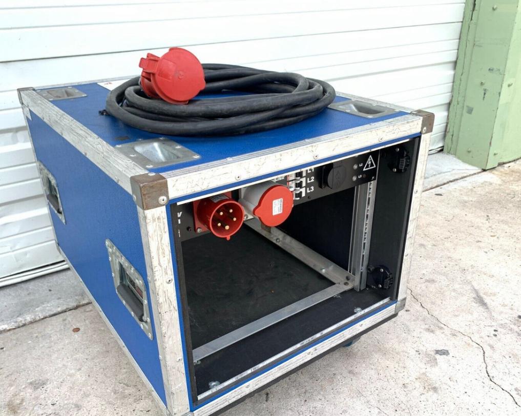 Durable 9U shock-proof amplifier rack including power distribution and power cable, designed to protect and power your audio equipment during transport and use.