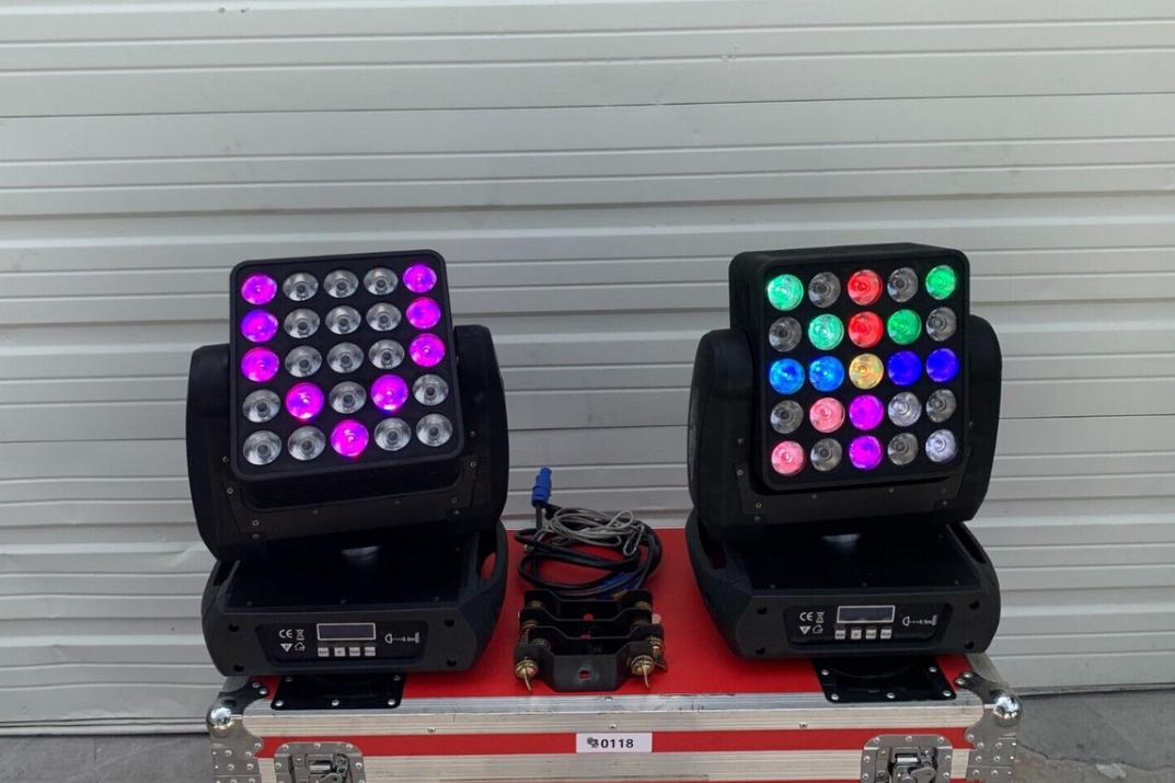 The LY-2512M 25x12W RGBWA LED Matrix Moving Head Wash delivers dynamic color mixing and precise movement for vibrant wash effects. Ideal for stage, concert, and event lighting, this pair of fixtures is housed in a durable case for easy transport and protection.
